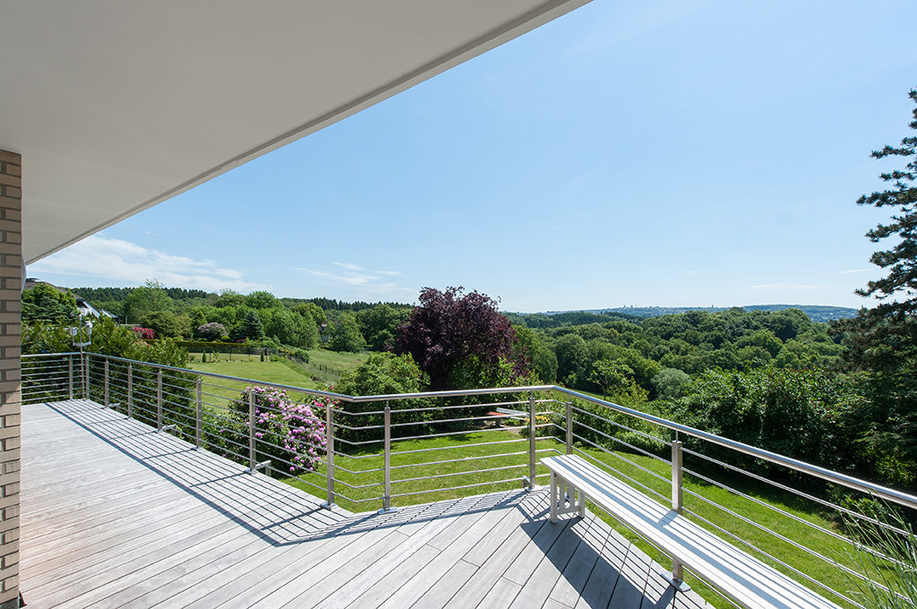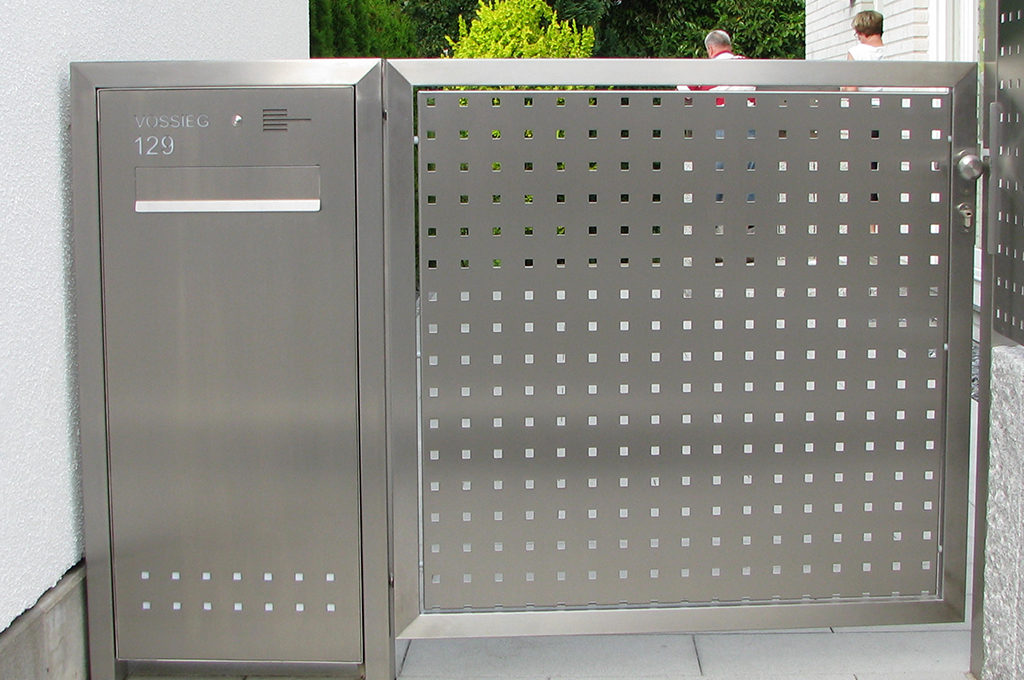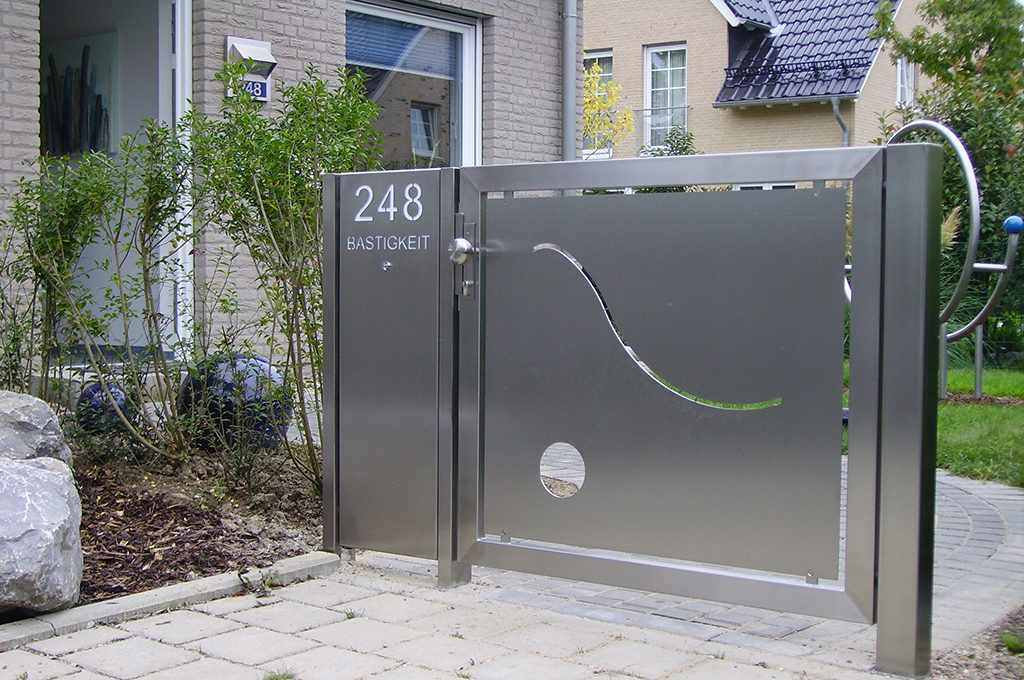 Bei der Renovierung einer denkmalgeschützten Villa in Wuppertal erhielten wir den Auftrag, die historische Toranlage zu verbreitern. – und zwar auf Wunsch des Denkmalpflegers in genau der ursprünglichen Optik. Nach der Demontage der Torflügel wurden die Bauteile aufwendig mit Sand gestrahlt, um eine lackfreie, schweißbare Oberfläche zu erhalten. Dabei traten immer mehr Details, wie Gravuren, zutage. Dann wurden die zur Verbreiterung notwendigen Elemente nachgebaut (die typischen Bögen der Tore reflektieren die Leidenschaft des ursprünglichen Bauherrn für die Fliegerei) und in die Anlage integriert. Die gesamte Anlage wurde erneut gestrahlt, grundiert und mit einem Speziallack pulverbeschichtet. Das Ergebnis erfreute den neuen Besitzer ebenso, wie die Denkmalschützer.