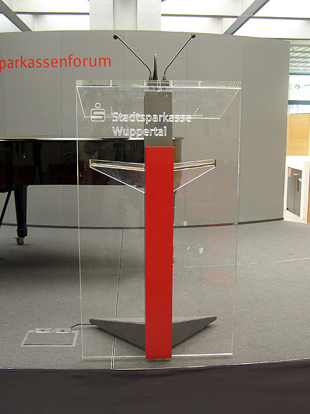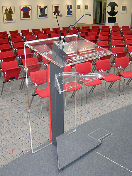 Designrednerpult: Kombination aus Stahlfuß, abgewinkeltem Aluminium Standrohr, sowie Audio-Kopf aus Edelstahl im Kopfende eingelassen.