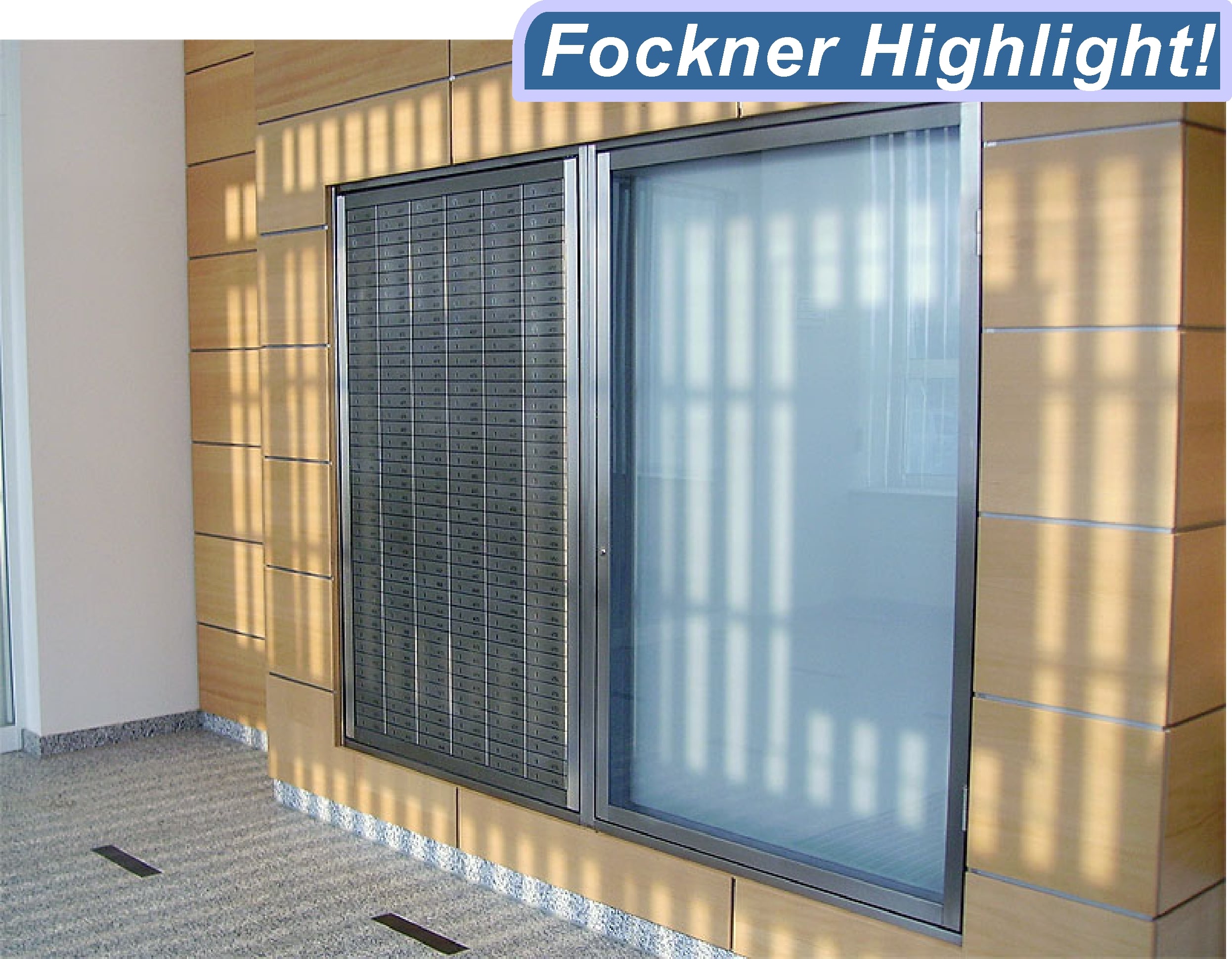 Zentrale Eingangsanlage, Stahlunterkonstruktion aus Quadratrohr, Außenverkleidung aus pulverbeschichteten und gekanteten Al-Blechen. Spezial- Briefkasteneinschub aus V2A.